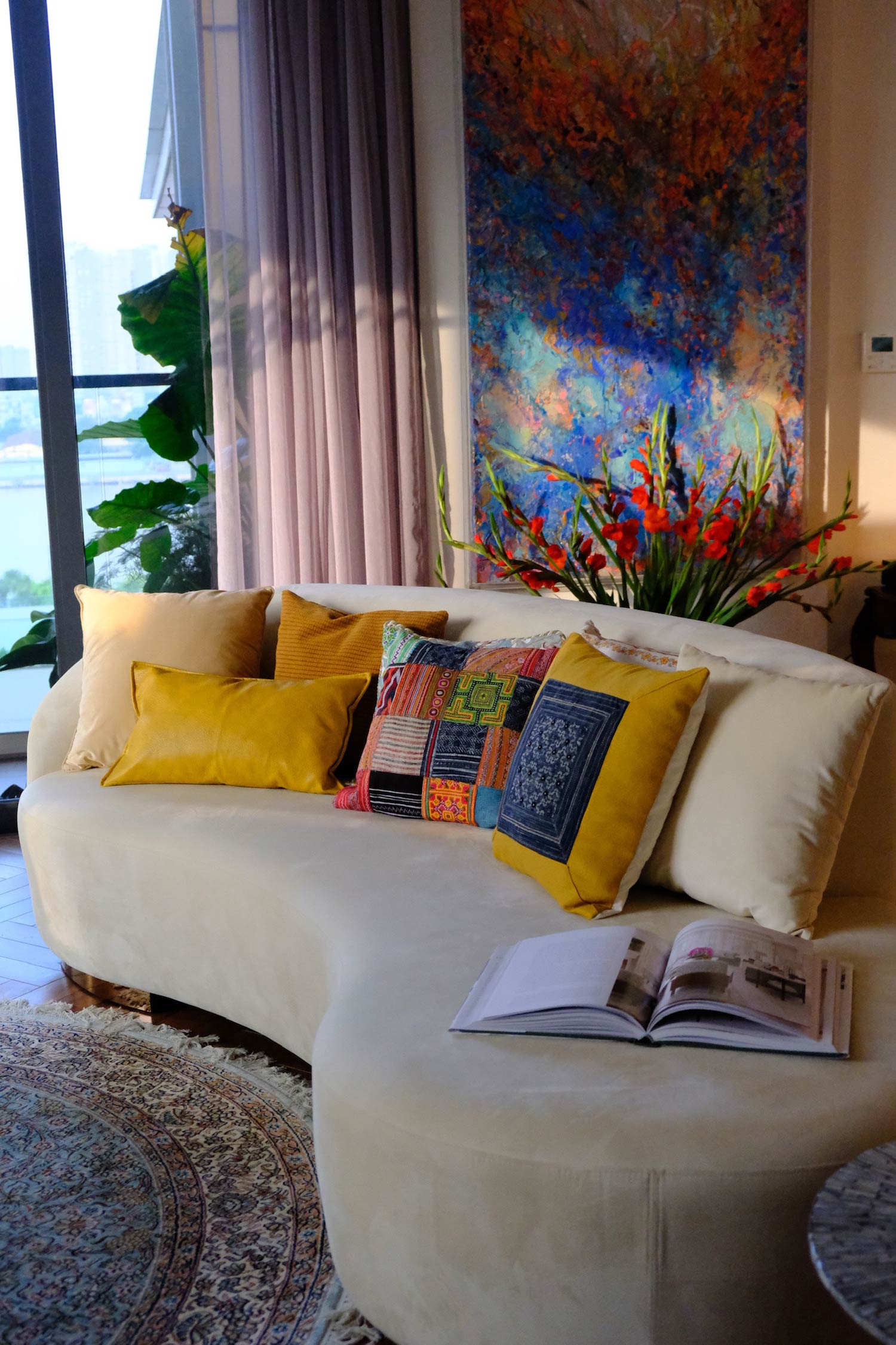 Phòng khách, nơi tụ họp của gia đình và bè bạn, cũng là góc nhìn đẹp hướng ra sông Sài Gòn.